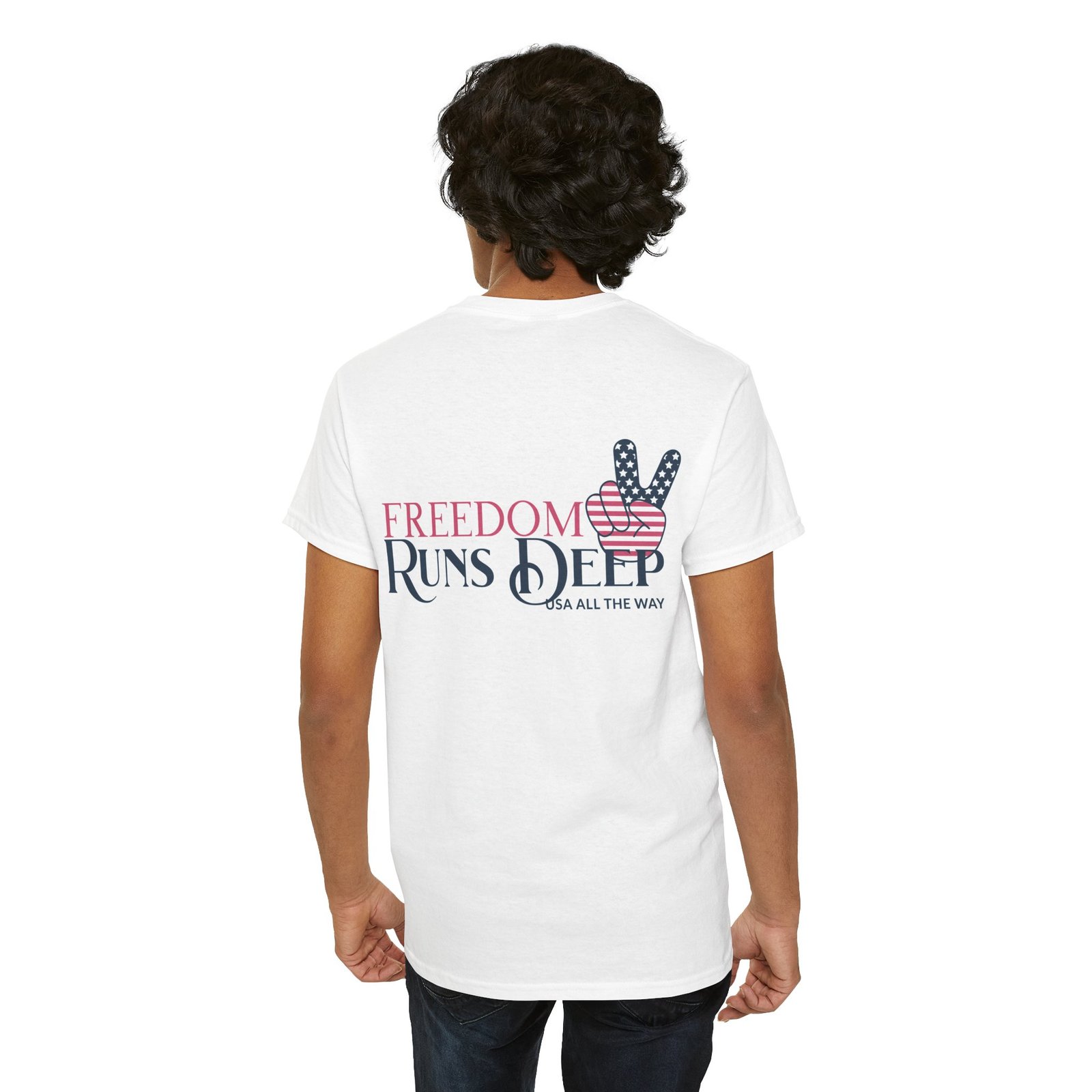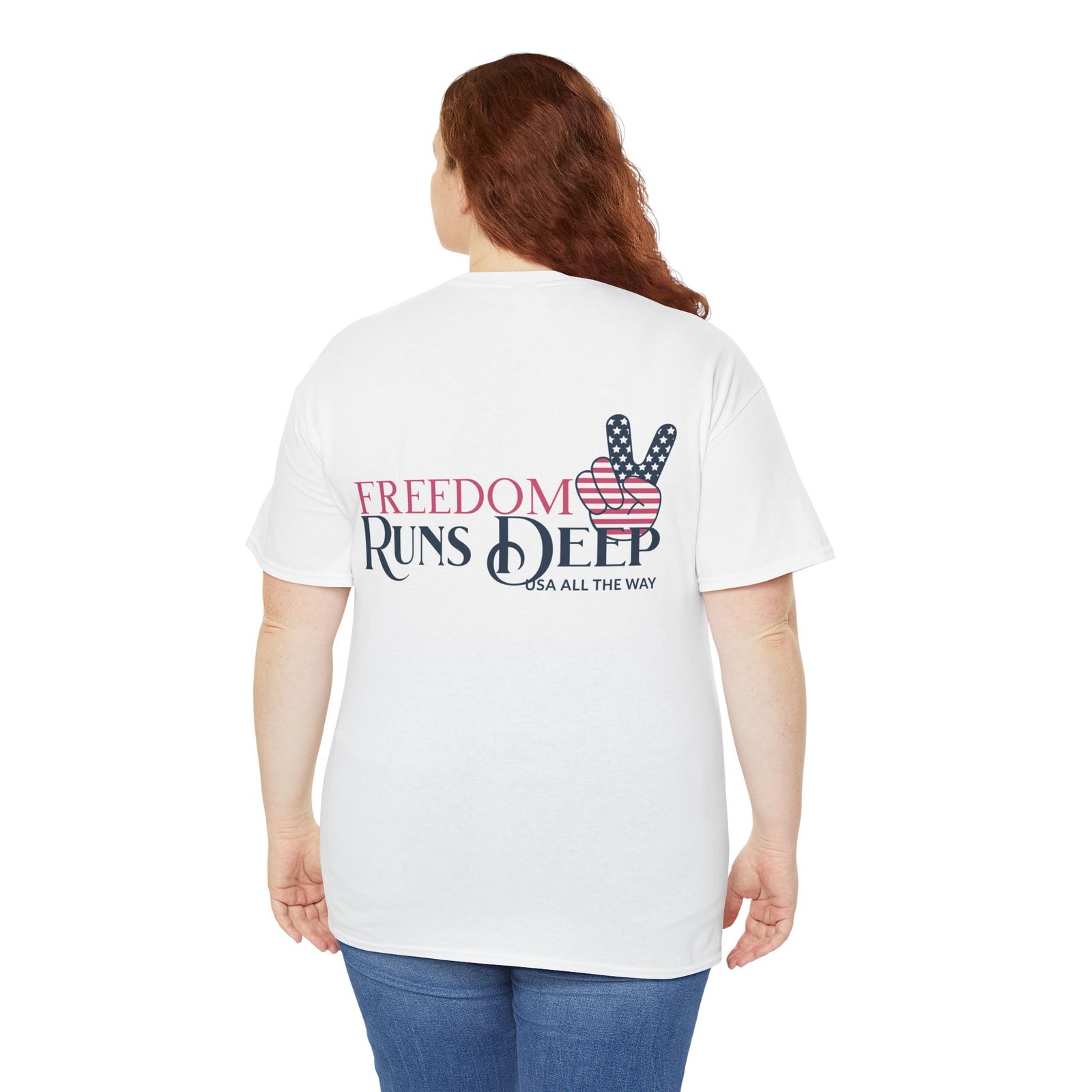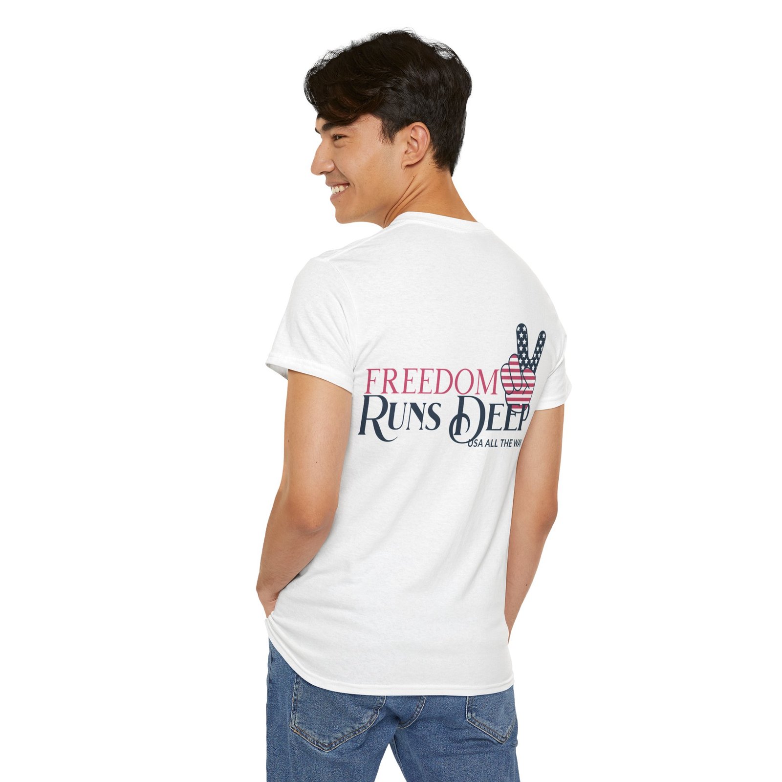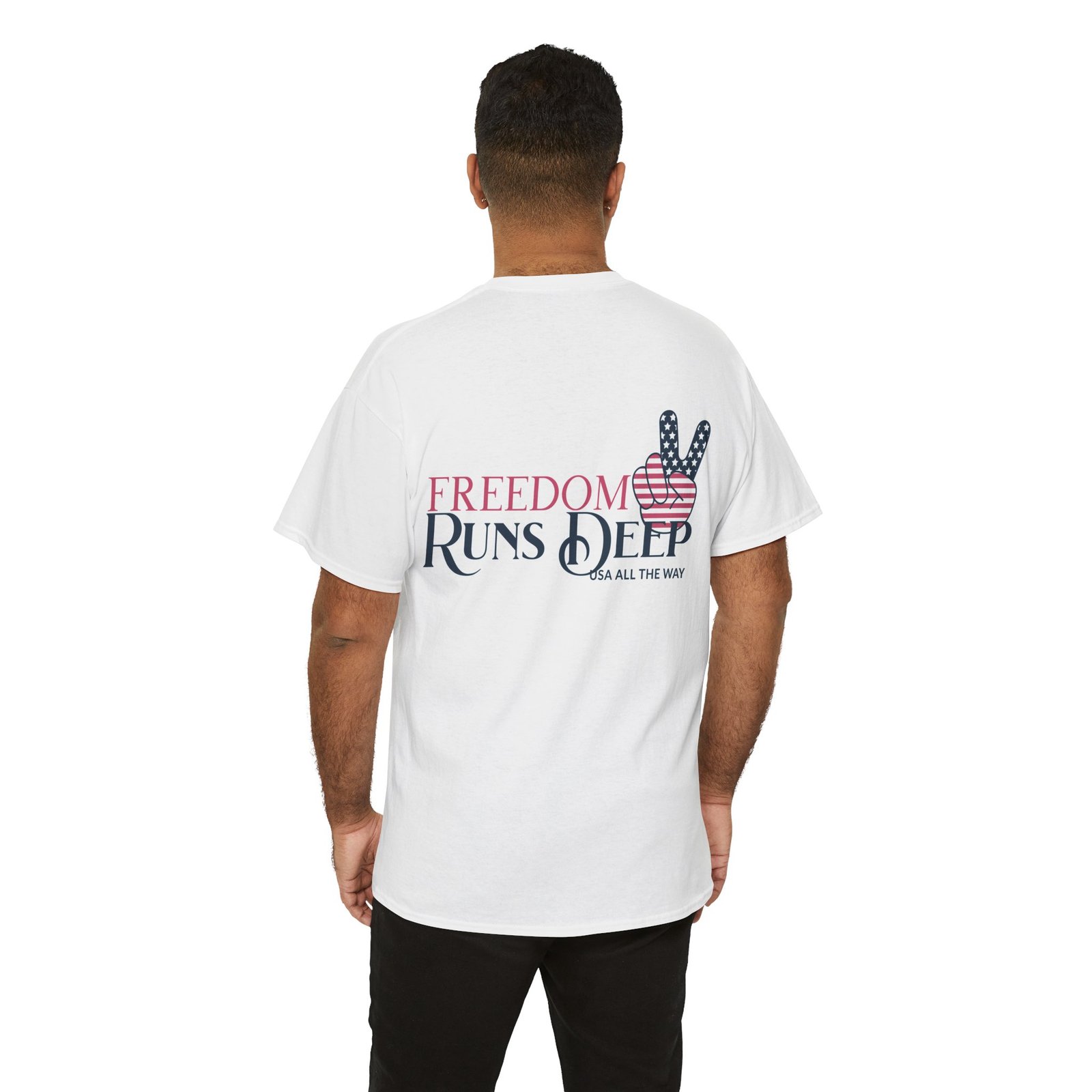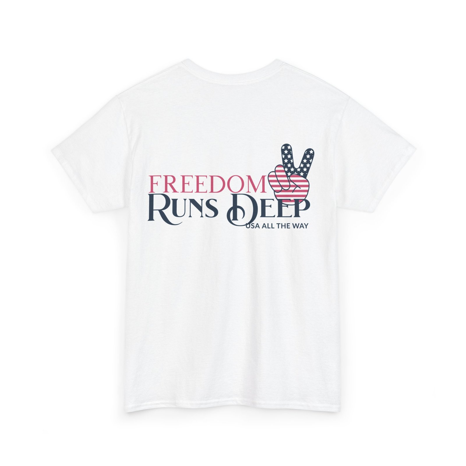 - Design: “Freedom Runs Deep” text with an American flag-themed peace sign.